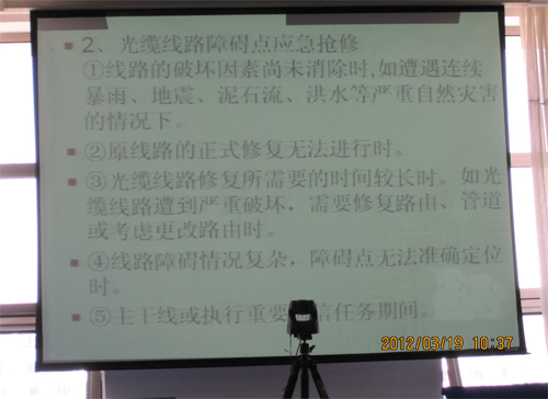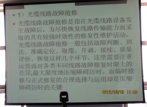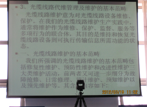 2012年3月公司組織所有維護人員進行理論、技術、管理、素質等綜合培訓,外聘專業(yè)指導老師現場進行《光纜線路代維管理培訓》,并現場進行光纜接續(xù)演練及理論知識考試。通過本次業(yè)務培訓,提高了維護人員的理論管理水平,增強了技術人員搶修能力,為努力打造一支過硬的維護團隊奠定了基礎。